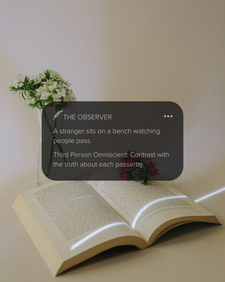 Use these prompts to explore how different narrative perspectives shift the emotional tone, structure, or focus of a scene. Try rewriting the same prompt from more than one POV for added insight.